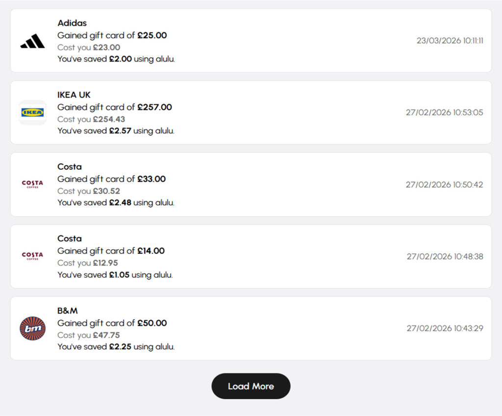 alulu gives you access to discounted digital gift cards from a wide range of well-known brands. Each brand offers a specific discount percentage—meaning you pay less than the face value of the gift card. For example, an Adidas gift card comes with an 8.0% discount, Costa offers 7.5% off, and Starbucks provides 7.5% off.