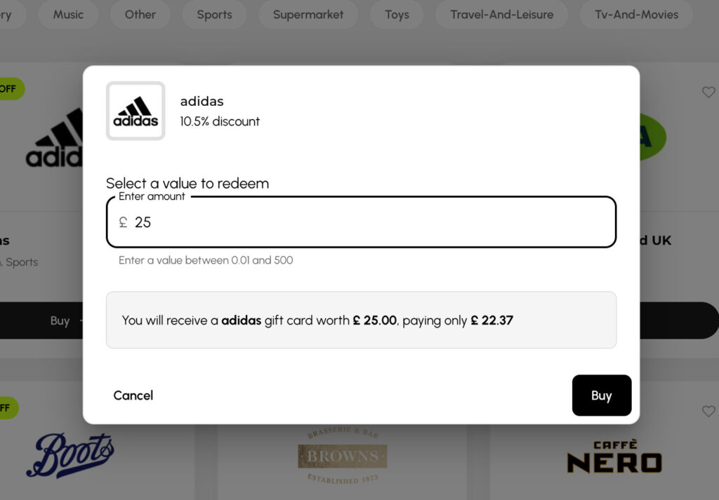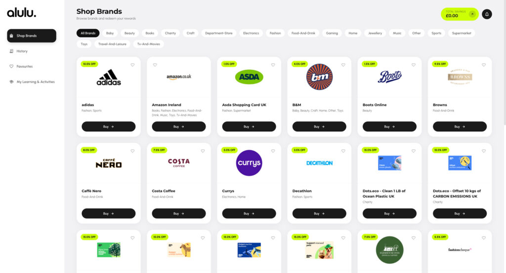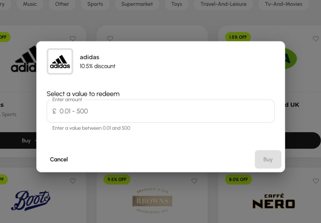 Brands are organised into categories including Fashion, Food & Drink, Gaming, Home, Music, Sports, Supermarket, Travel & Leisure, and more—so there’s something for everyone.